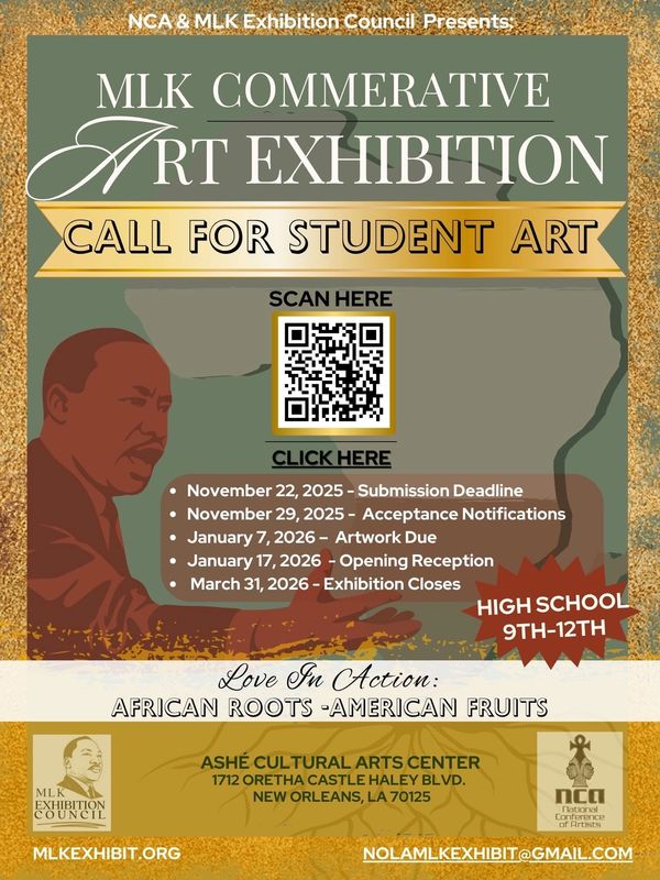 The NCA MLK Exhibition and related activities celebrate the life and legacy of Reverend Dr. Martin Luther King Jr., the Civil Rights Movement, and those working to further peace and human understanding. Through the arts, we give recognition to the people around the world who work tirelessly for peace, justice, and responsible environmental cohabitation. We develop annual art displays, receptions, lectures, research tours, and webinars will reflect the theme activities based on one of Dr. King’s writings, speeches, or sermons. The exhibition offers diverse opportunities for local and national students, first-time or infrequent exhibitors, and established artists to receive recognition and sell their artwork. We provide a host of cultural, educational, and entrepreneurial opportunities. Visiting the MLK exhibition is a tradition for some people and one of the highlights of New Orleans’ Martin Luther King Jr. Holiday week of activities.